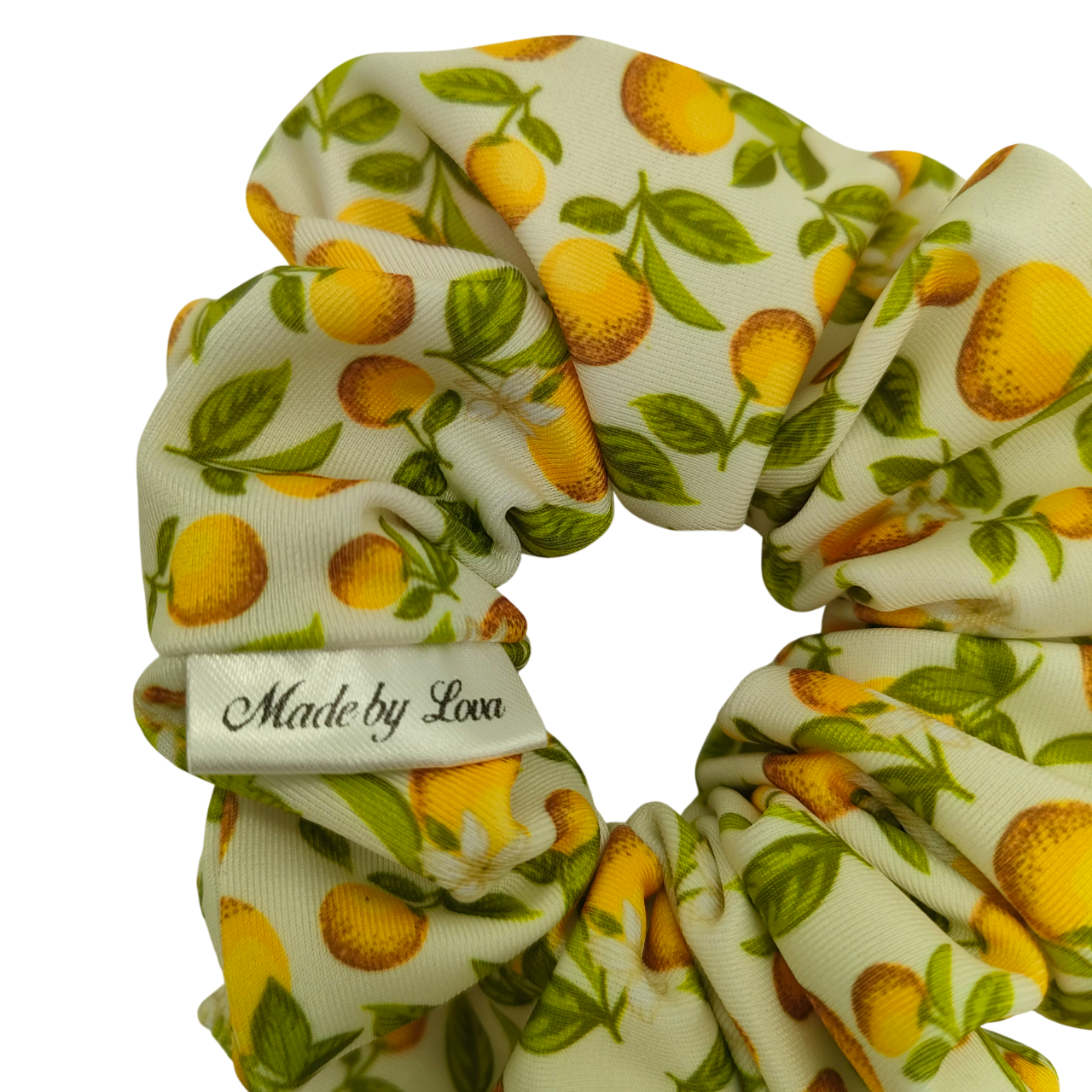 Een zomerse scrunchie met citroenen. Gemaakt van lycra, waardoor deze ideaal is voor tijdens het zwemmen. Lycra is de stof waar badkleding van gemaakt wordt. Hierdoor blijft deze scrunchie veel langer mooi bij gebruik in water, dan een scrunchie die gemaakt is van een ander soort materiaal. De zwemscrunchie zuigt zich niet vol met water, waardoor deze niet zwaar gaat aanvoelen tijdens gebruik.