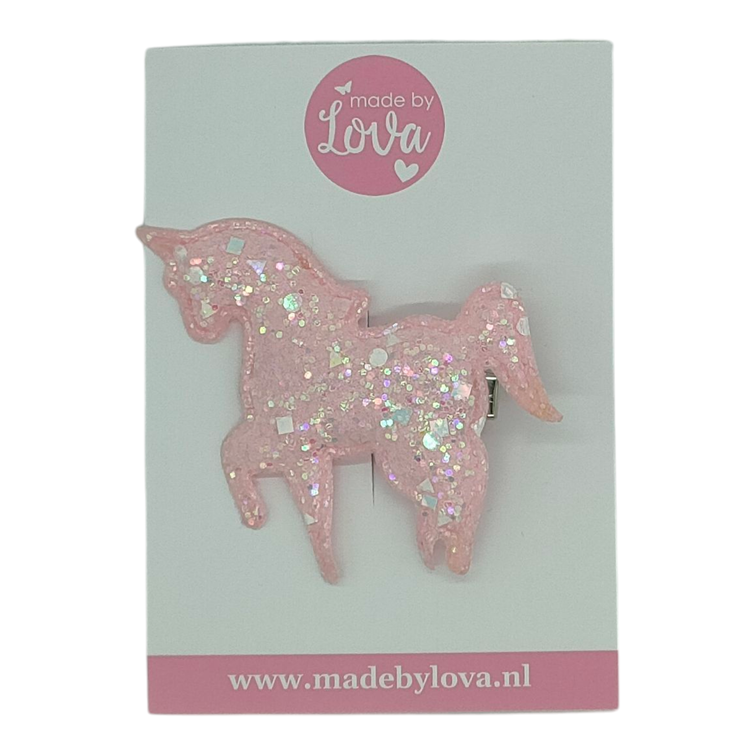 – De eenhoorn is 6 cm breed en bevestigd op een alligatorspeldje van 4 cm.