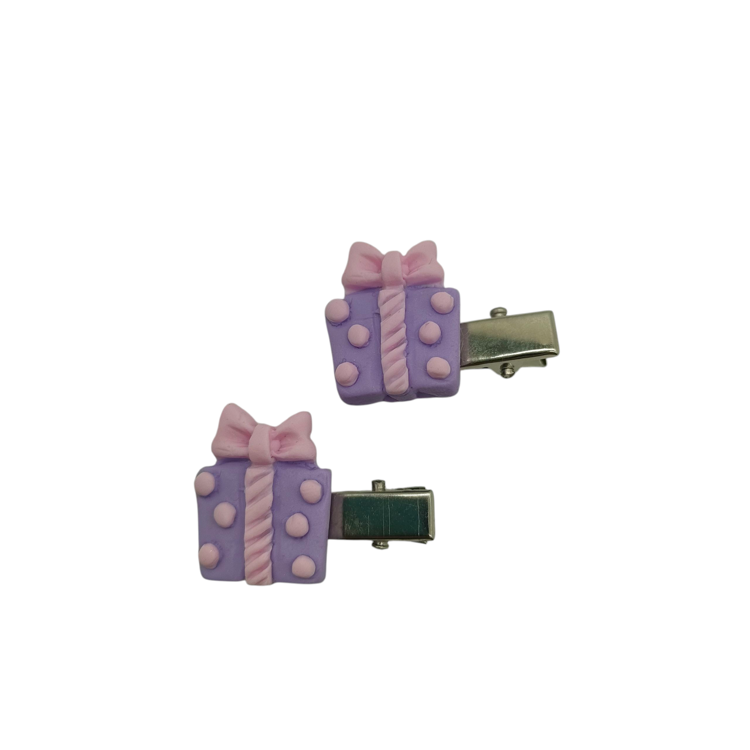 Voor de kleine meisjes een klein haarspeldje met een cadeautje. De cadeautjes zijn gemaakt van fimo en 2×2 cm. Ze zijn bevestigd op een alligator speldje van 28 mm. Door de tandjes die dit speldje heeft, blijven ze goed zitten in het haar. Je ontvangt een setje van 2 stuks.