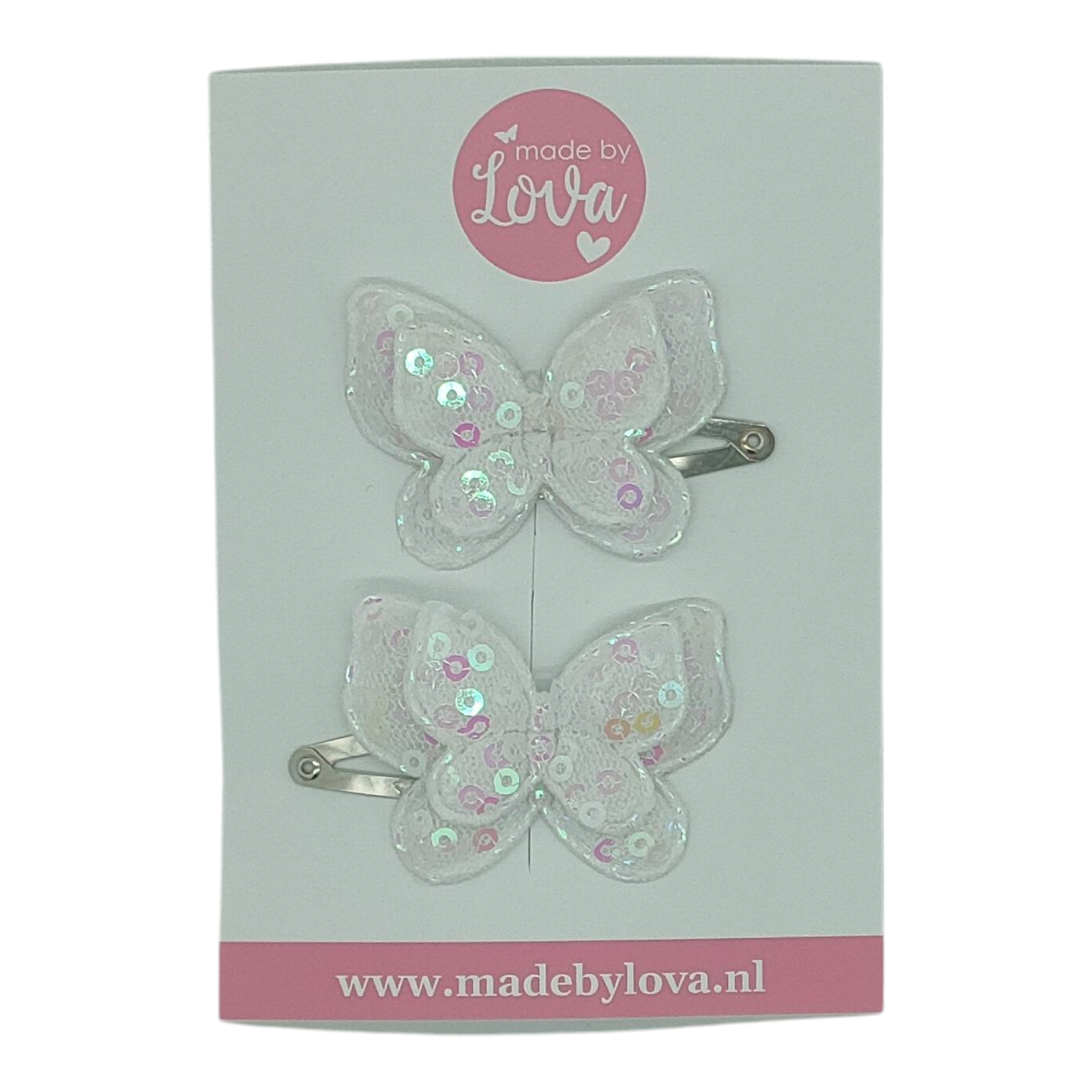Prachtige dubbele vlinders met pailletten. Hierdoor heeft deze een kleine glinstering erin. De vlinders zijn bevestigd op een klikklak speldje. Maak jij bijvoorbeeld 2 staartjes in het haar bij je meisje, dan zijn de vlinders zo bevestigd dat er een linker en rechter speldje is.