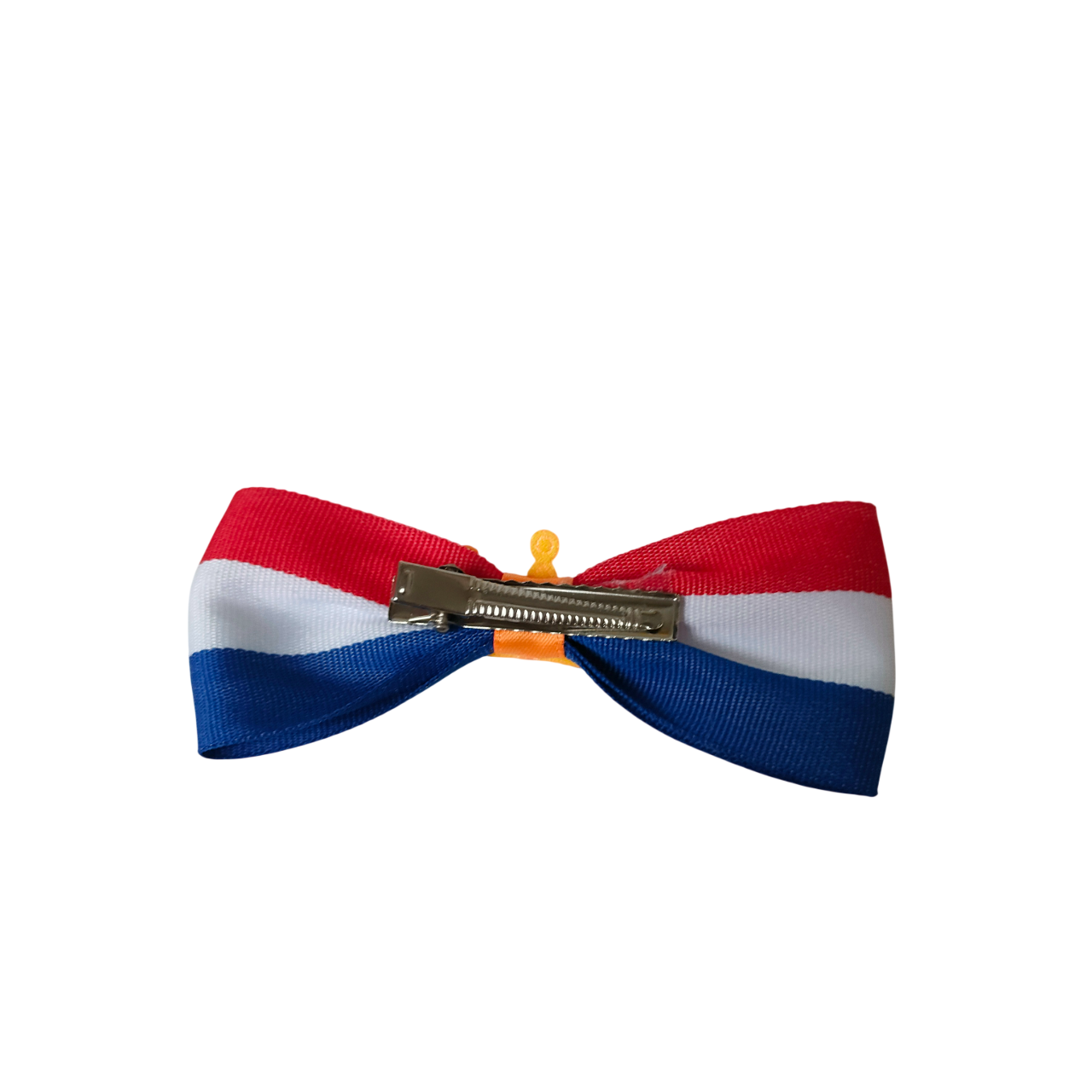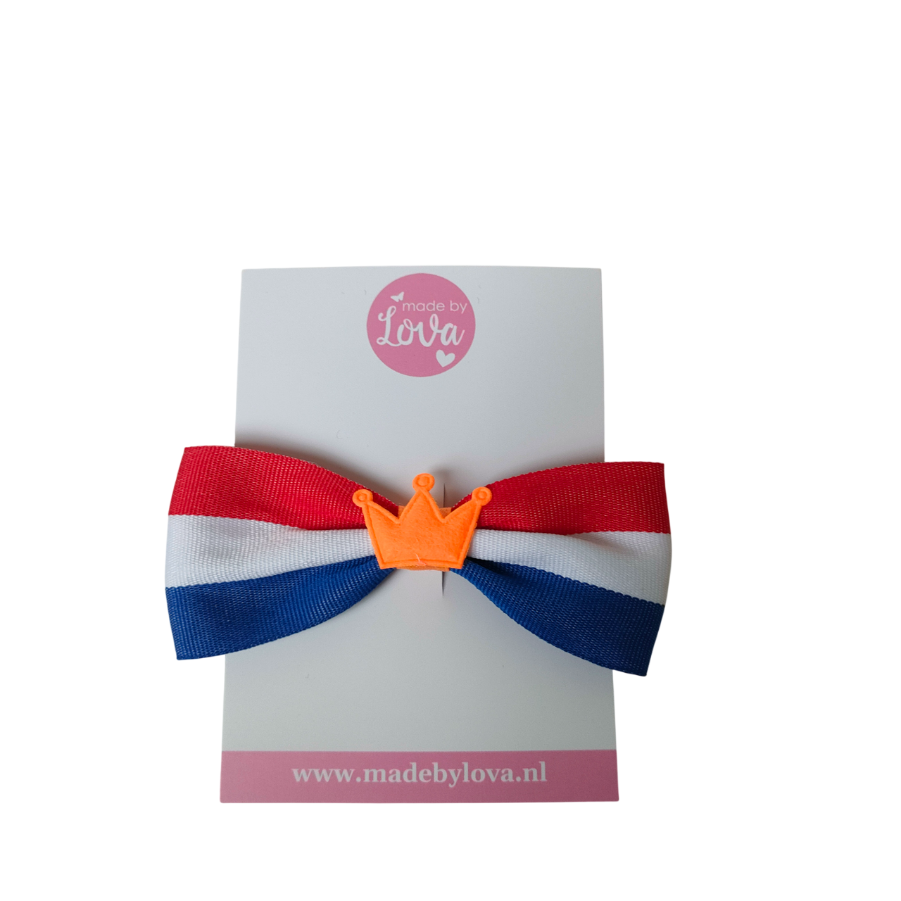 Een mooie grote haarstrik voor Koningsdag. Met een klein oranje kroontje in het midden.