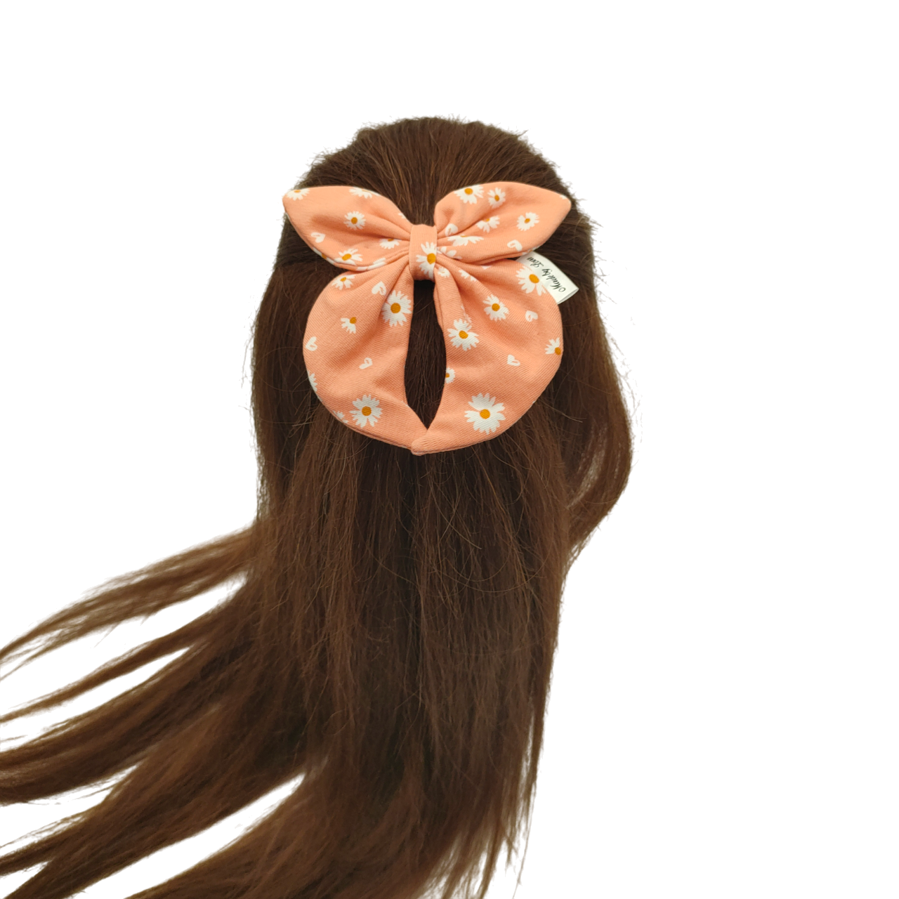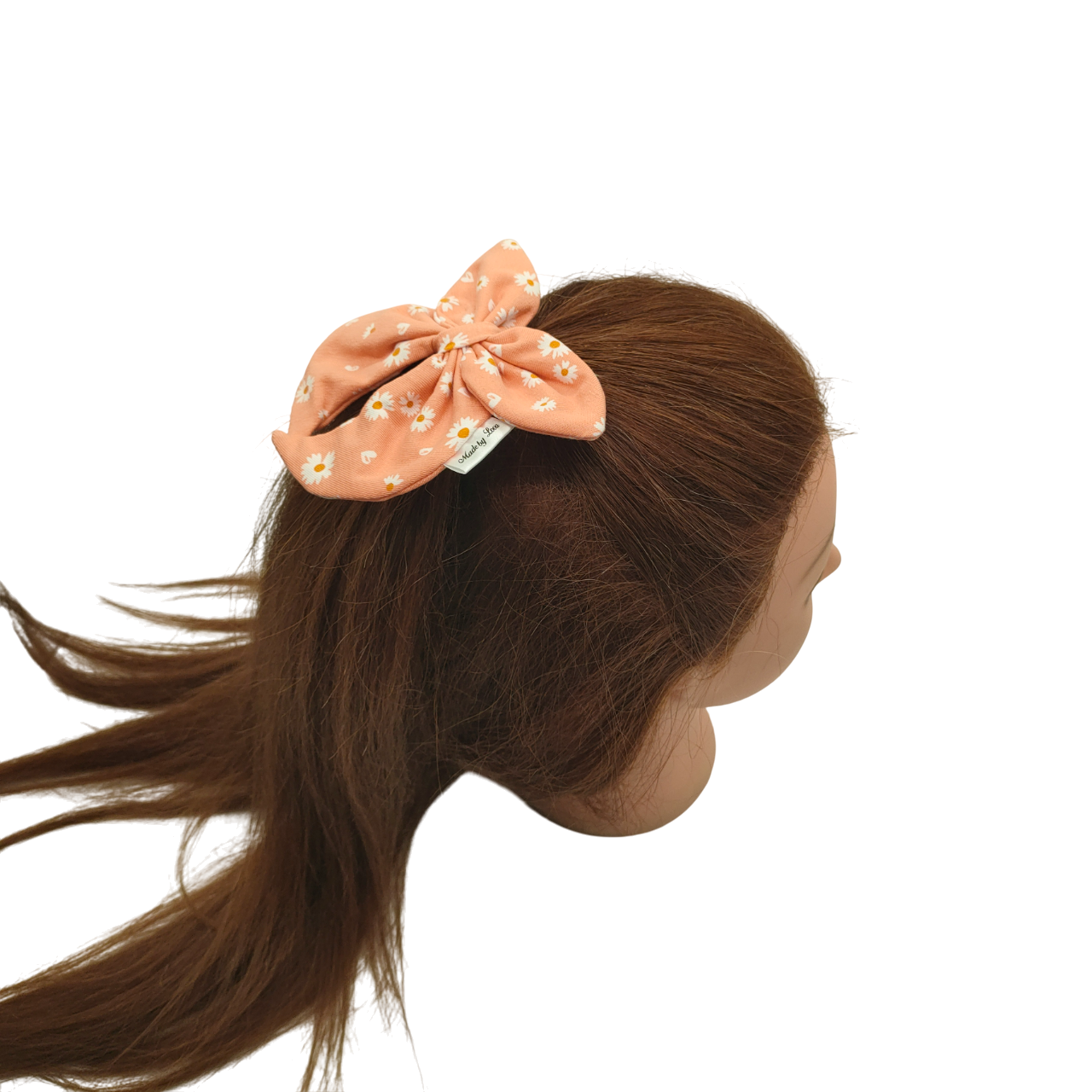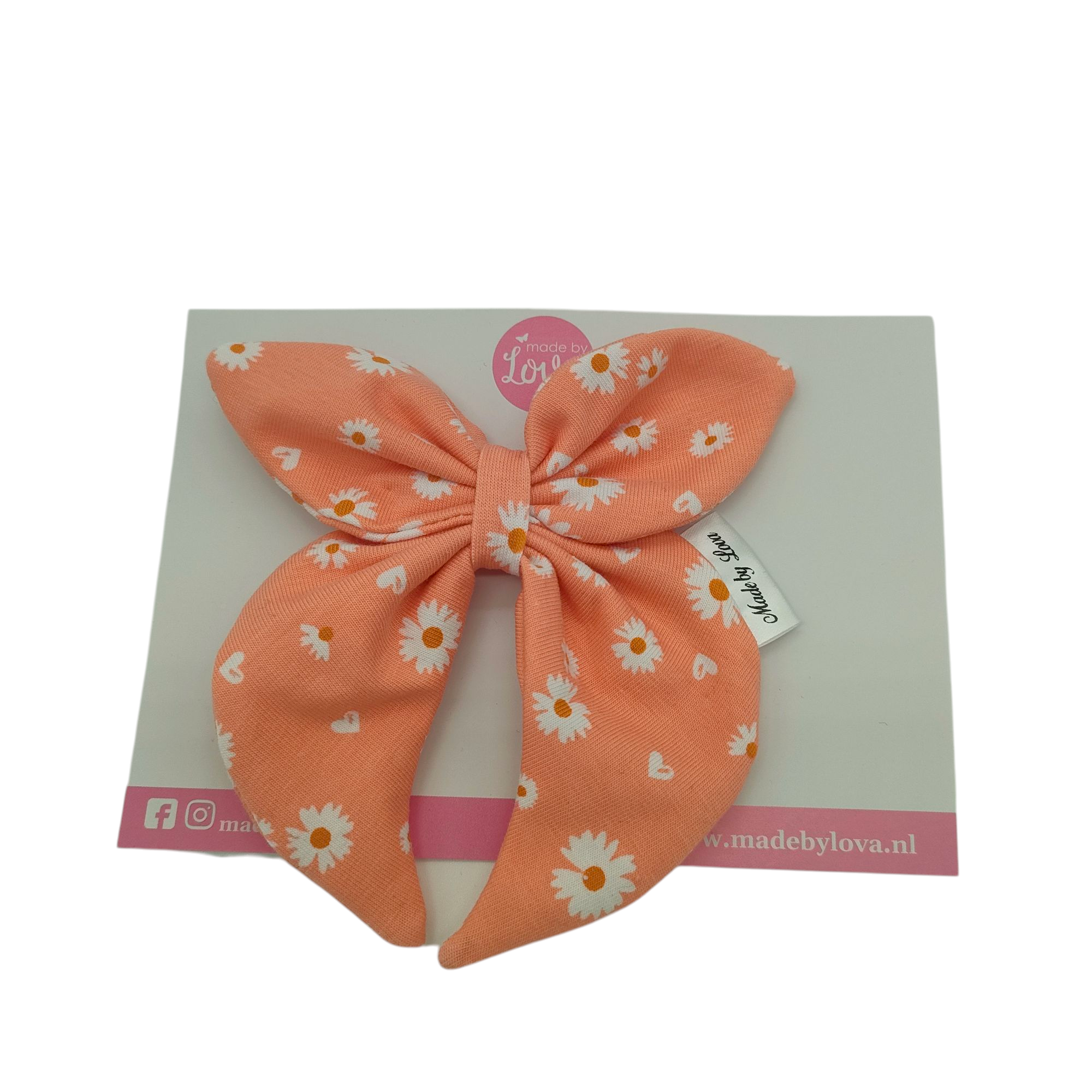 Een mooie haarstrik in de kleur oranje met madeliefjes. De strik is bevestigd op een alligatorspeldje, die door de kleine tandjes goed in het haar blijft zitten. Door het formaat van deze strik is deze leuk voor iedere leeftijd. Verkrijgbaar in verschillende kleuren.