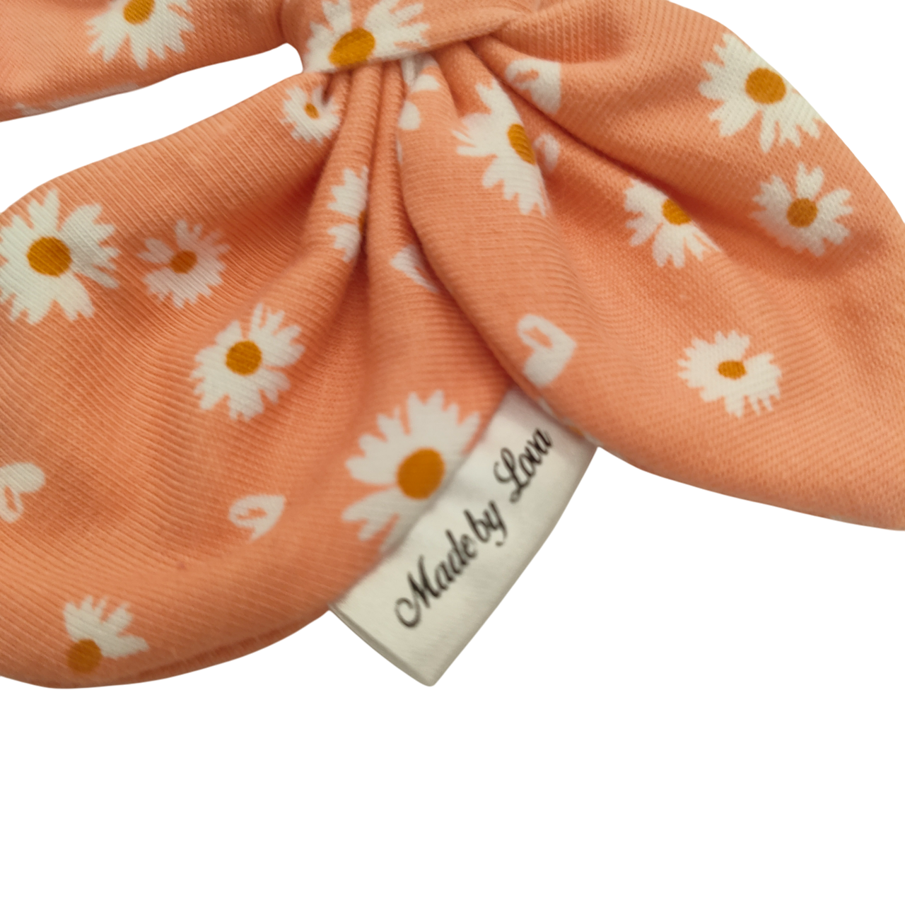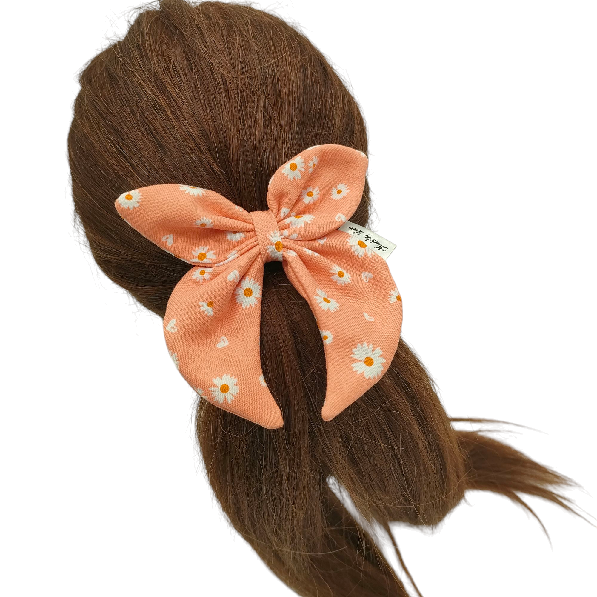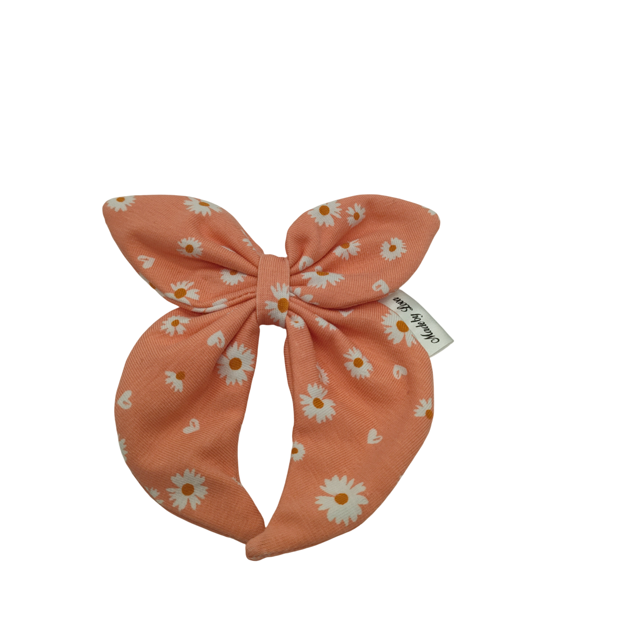 Een mooie haarstrik in de kleur oranje met madeliefjes. De strik is bevestigd op een alligatorspeldje, die door de kleine tandjes goed in het haar blijft zitten. Door het formaat van deze strik is deze leuk voor iedere leeftijd. Verkrijgbaar in verschillende kleuren.