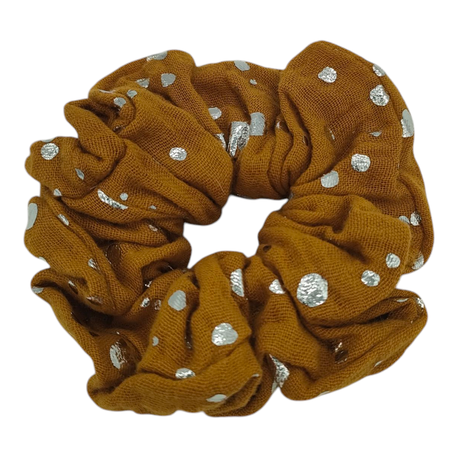 Deze okergele scrunchie is voorzien van zilveren stippen.