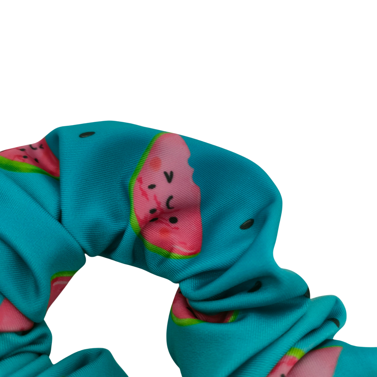 Een mooie turquoise scrunchie met partjes watermeloen. Top voor een zomerse outfit aan het water.